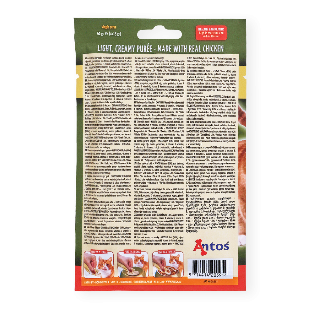 Nuestras Delicias para gato de puré de pollo están hechas con ingredientes sabrosos de gran calidad. Cada delicioso tubo contiene un 90 % de humedad, convirtiéndolos en delicias hidratantes y saludables para darle con tranquilidad a tu amigo felino. Excluimos cereales y aditivos y añadimos cosas buenas como la taurina y varias vitaminas para impulsar la salud general de tu gato.